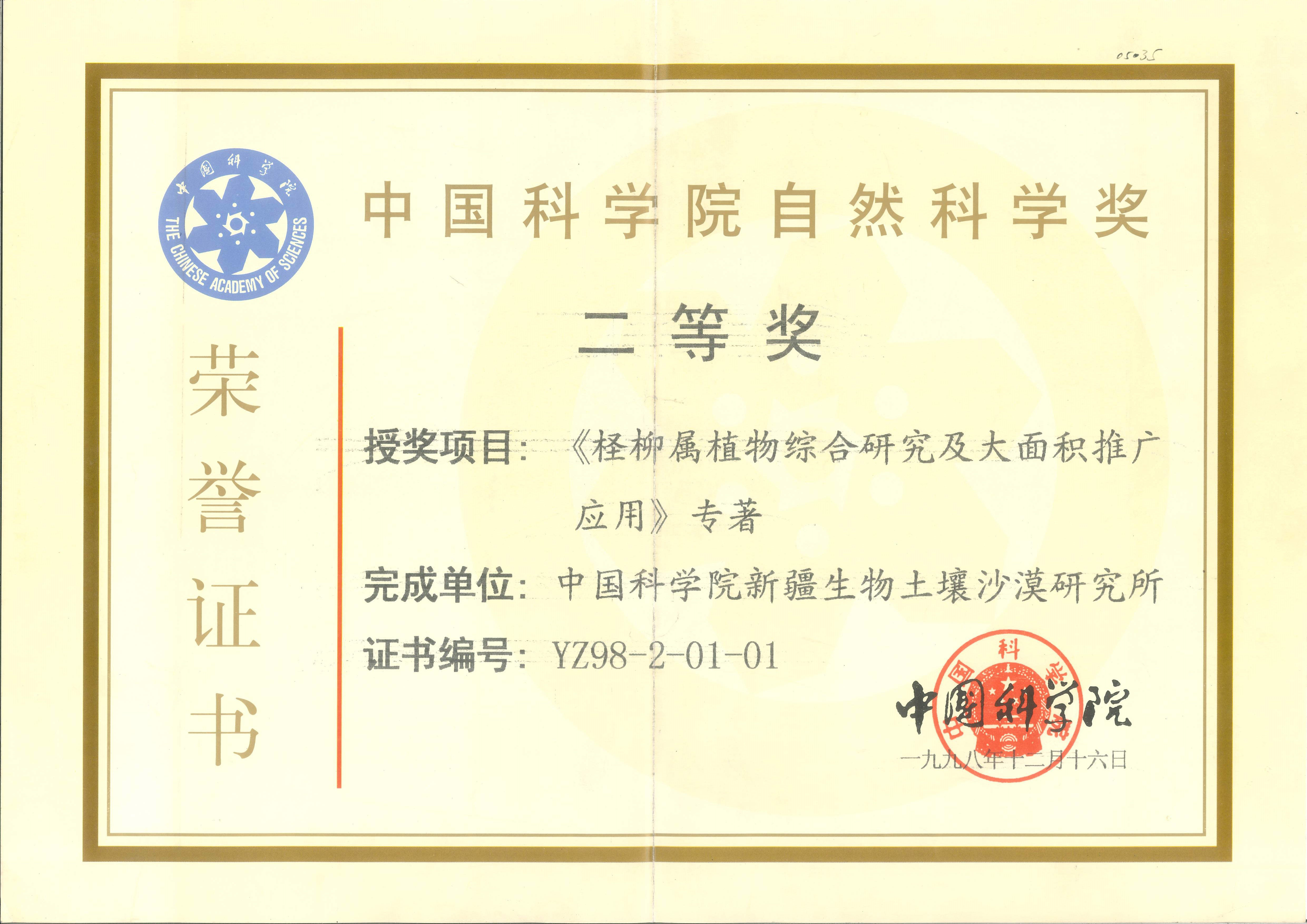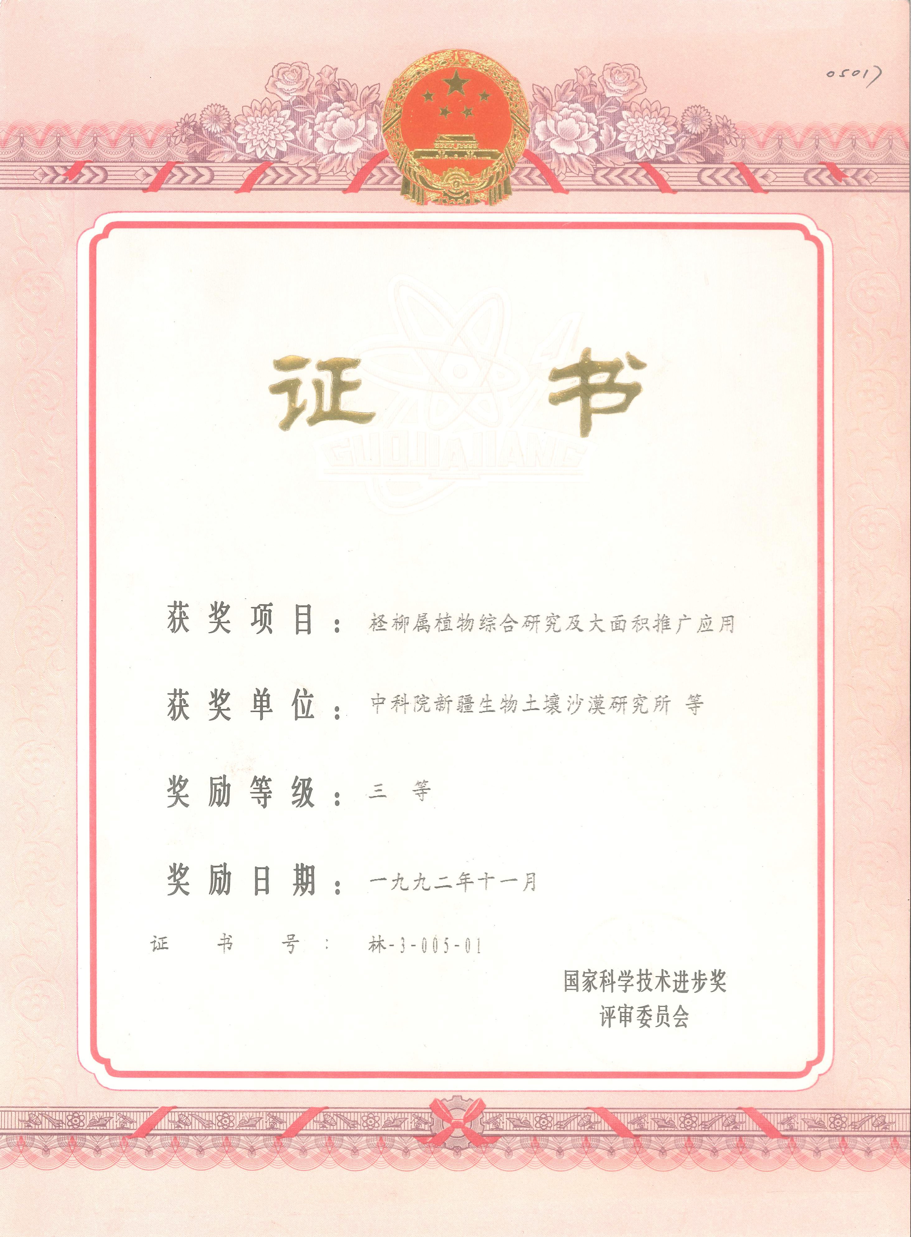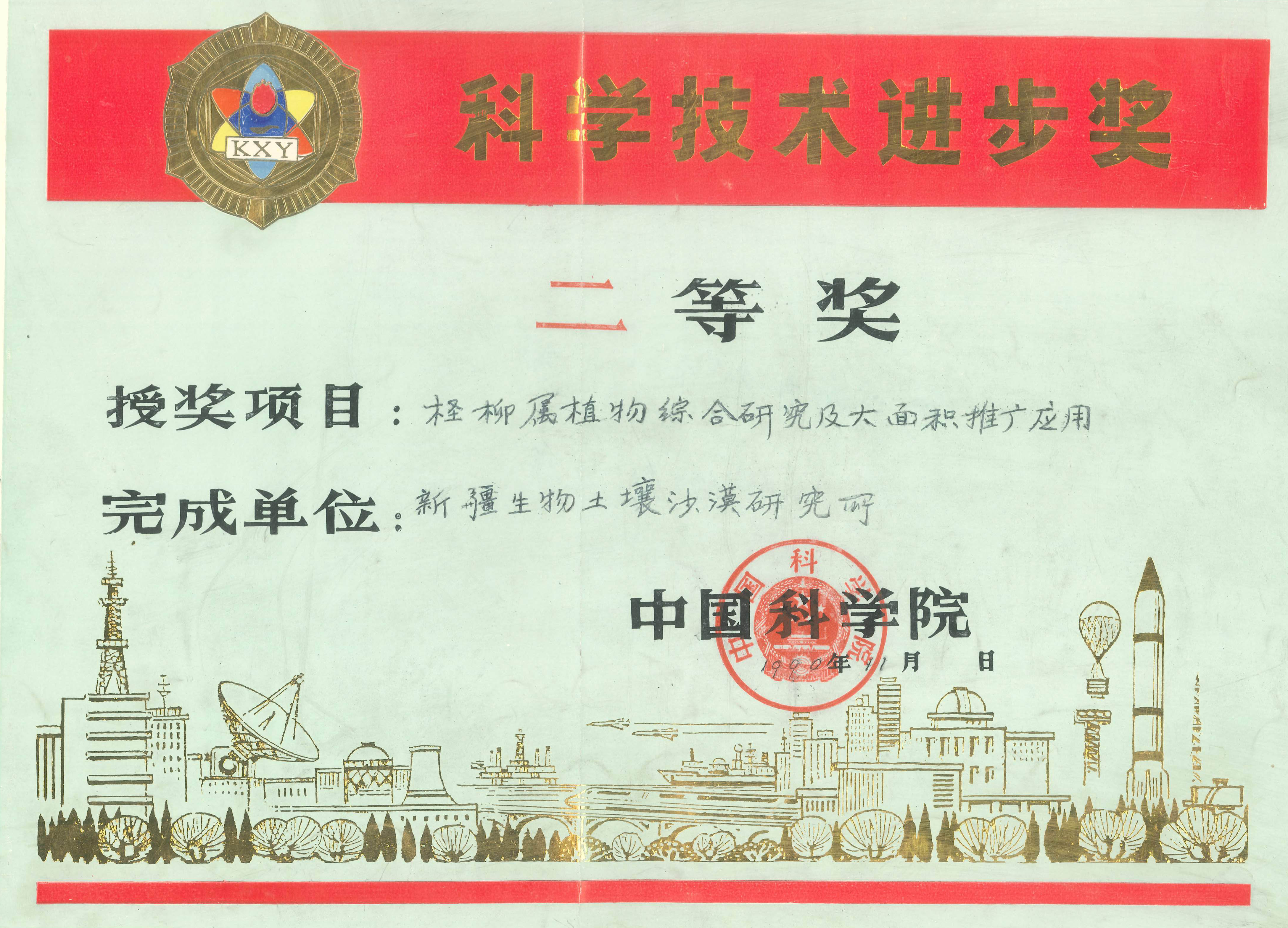 柽柳属植物在我国西北荒漠,半荒漠地区普遍分布,它具有种类多范围广面积大防风固沙性能优良,能适应多种不良自然环境,而且还具有广泛的经济用途。柽柳属植物既抗旱又不怕水淹,还具有抗风蚀、沙埋耐盐碱、寿命长等特点,所以它成了沙荒盐碱地带固沙造林必不可少的造林树种。国内柽柳固沙造、林盐碱地造林中,我们首先采用深栽技术,在风蚀光板地、荒山、砾石戈壁、流动沙地、盐渍化沙地以及重盐碱地多种立地条件下进行造林,均获得成功。另外,我们在全国首先采用引洪大面积推广柽柳育林工作,这些都是国内柽柳造林中的先进技术。沙荒、盐碱地,引洪大面积发展柽柳人工林在新疆南疆广大地区普遍展开,引洪发展柽柳林成为南疆塔里木盆地各县及军垦农场快速大面积发展荒漠柽柳林的一项主要育林措施。经过引洪大面积推广柽柳林,伽师、策勒、于田、民丰,推广面积已达几十万亩。发展人工柽柳林前1985年和发展以后1990年相比人均收入增加385.16元,伽师、策勒、于田、民丰四县丢掉了贫困县的帽子。本项目先后荣获1990年中科院科技进步二等奖、1992年国家科技进步三等奖。