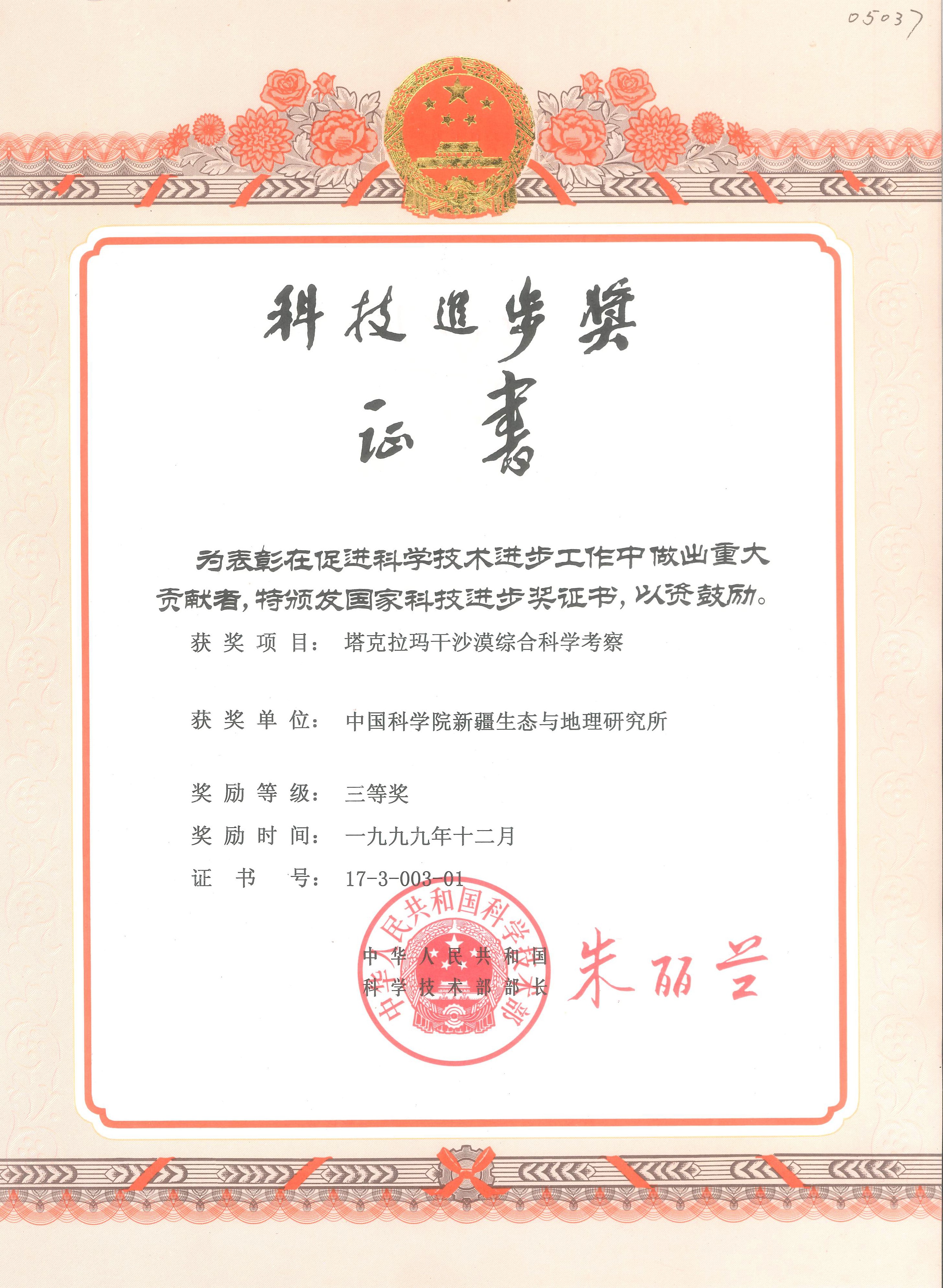 本项目包括沙漠气候、地貌、第四纪地质和沉积环境、水资源及其开发利用条件、土地资源评价与利用前景、生物资源评价、历史时期人类活动与环境变迁、资源与环境等。首次对塔克拉玛干沙漠天气和气候取得系统、完整和准确的认识,初步掌握沙漠现代天气、气候特征和规律;对沙漠中央部分地貌特征取得一系列新认识;对本区各地貌单元上的新生代地层提出了新的划分方案;对沙漠水、土、生物资源取得较为系统的认识和初步量化的了解;首次提出“沙漠环境考古学”的新命题,对人类活动与沙漠环境变迁的关系首次进行全面的探索和阐述。本次考察,是塔克拉玛干沙漠研究史上规模最大、时间最长、范围最广、学科专业较齐全、科学内容最丰富的一次综合性科学考察。提出了大量新的认识、新观点、新结论,具有重要的学术意义,考察依托沙漠油气勘探和周边经济发展,注重了与生产实践的结合,具有重要的生产指导意义和示范意义;为沙漠及沙漠化研究的学术交流和国际合作创造了条件,具有重要的社会影响。该项目被评为1999年度国家科技进步三等奖。