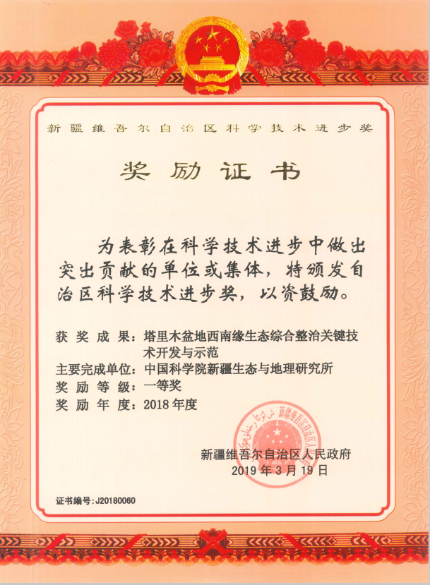 项目诊断了南疆三个地州山区草地、灌区农田、绿洲外围、荒漠河岸的生态环境问题,开展了区域治理区划和典型流域单元的生态功能区划,揭示了主要引种植物的抗逆性,筛选了耐寒抗旱牧草品种、耐盐作物品种、抗旱耐盐经济物种并研发了种植技术,研发集成了山区草地修复、灌区盐渍化土壤改良、绿洲外围生态屏障建设、荒漠河岸植被恢复关键技术与模式,构建了塔里木盆地西南缘山区、灌区、沙区不同环境类型的生态建设及可持续管理模式,搭建了技术成果推广应用信息平台与服务系统,创建了南疆三地州生态综合整治技术应用推广模式。该项目被评为2018年度自治区科技进步一等奖。