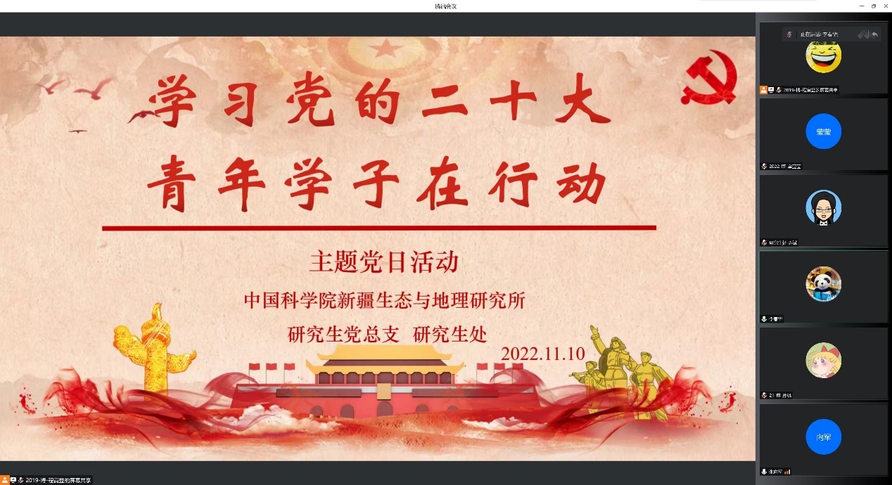 11月10日,中国科学院新疆生态与地理研究所研究生党总支开展“学习党的二十大,青年学子在行动”主题党日活动,深入贯彻学习党的二十大精神,研究所党委书记、副所长张向军作学习党的二十大精神专题党课,研究生党总支书记李春华主持会议,全体研究生参加会议。