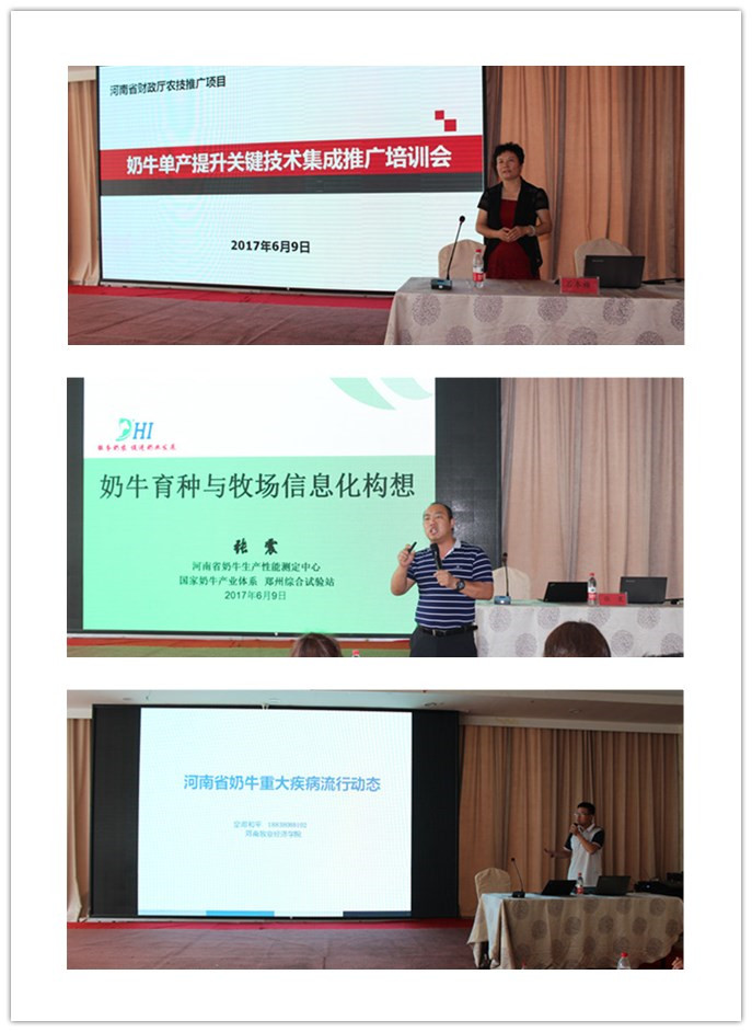 2017年6月9日上午,由我院“草食动物疾病研究”科技创新团队承担的河南省财政厅农技推广项目——“提升奶牛单产关键技术集成推广”培训会在洛阳顺利召开。参加本次会议的有河南牧业经济学院副校长张卫宪、科研处处长邱国鑫、科研处副处长胡华锋、国内著名奶牛疾病专家中国农业大学齐长明教授、河南省奶牛生产性能测定中心主任张震博士、洛阳市畜牧局局长李治力、洛阳市畜牧站站长王明旻、洛阳市及济源市规模化奶牛场的专业技术及管理人员、项目组成员及河南日报社、洛阳市电视台记者等近140人。会议由邱国鑫处长主持。