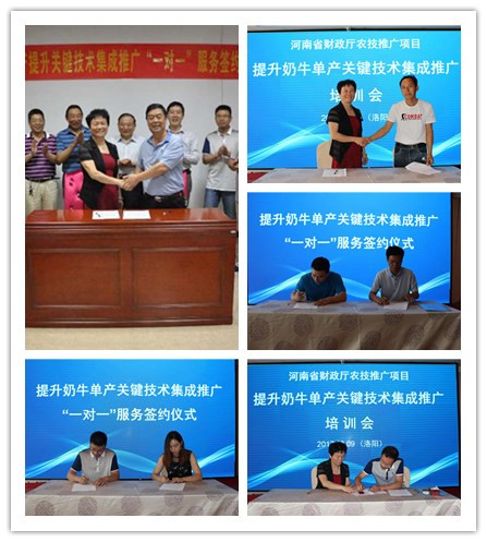 培训会开始,首先由“提升奶牛单产关键技术集成推广”项目主持人石冬梅教授介绍本项目的服务宗旨、服务团队、服务平台、服务方式及服务内容。接着,由中国农业大学齐长明教授为与会学员上了一堂精彩的专业讲座,并与部分学员进行了问答互动。随后,河南省DHI中心主任张震博士结合河南省奶牛生产性能测定中心的工作,用大量数据和成功案例介绍了奶牛选种选配的重要性及未来奶牛场信息化管理的模式。最后,皇甫和平博士结合项目组近几年开展的科研工作,作了题为“河南省奶牛重要疾病流行现状”的讲座,让与会学员充分认识到了奶牛疾病预防的重要性。中午12:30培训会结束,在接下来举行的“一对一”服务签约仪式中,项目组石冬梅教授、皇甫和平博士、宋予震副院长三位成员在现场与4家奶牛场负责人签订“一对一”服务协议。