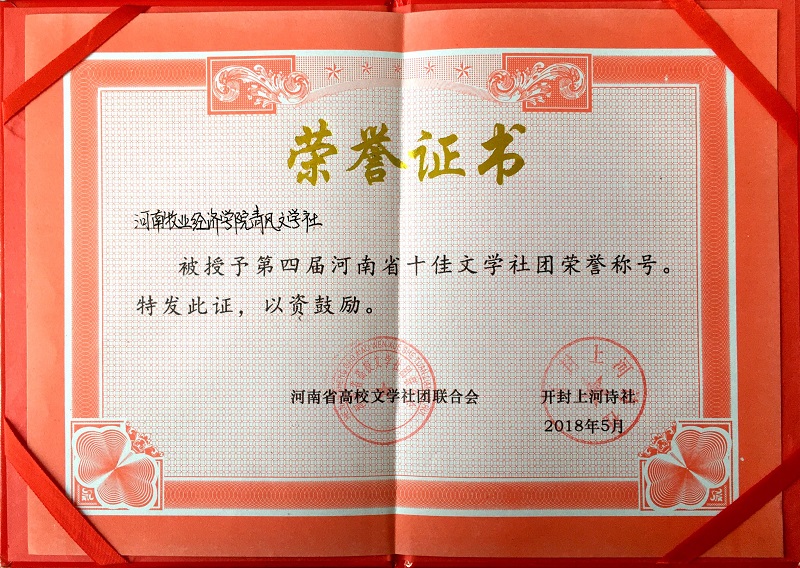 近日,第四届河南省高校文学社团交流峰会在开封河南大学金明校区顺利举办,来自河南省各地区的200多名高校文学社团代表参加了此次交流会,会上评选了“2018年度河南省十佳文学社团”、“二十二优秀社团”、“河南高校文联优秀干部和优秀会员”等,河南牧业经济学院动物医学院青风文学社作为参会代表之一,荣获“第四届河南省十佳文学社团”荣誉称号。