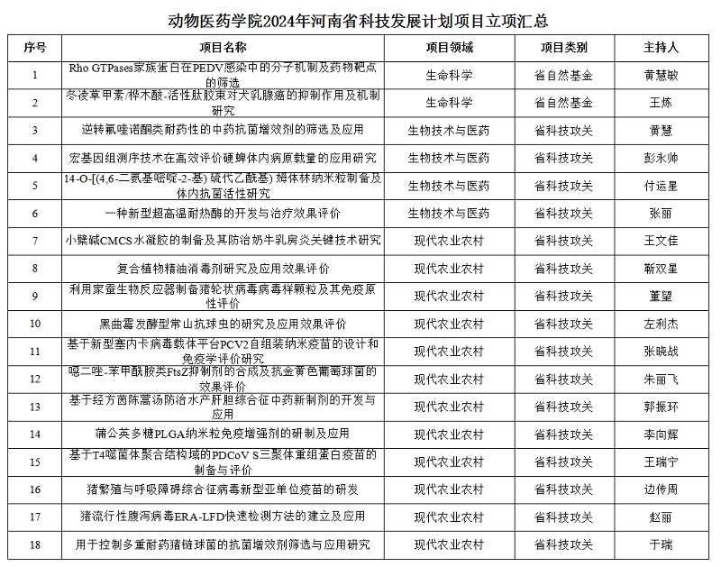 近日,河南省科技厅公布了2024年度河南省科技发展计划名单(豫科〔2024〕42号),我院有18位老师喜获2024年河南省科技发展计划项目立项,这是学院在省科技发展计划项目项目上的又一大收获。