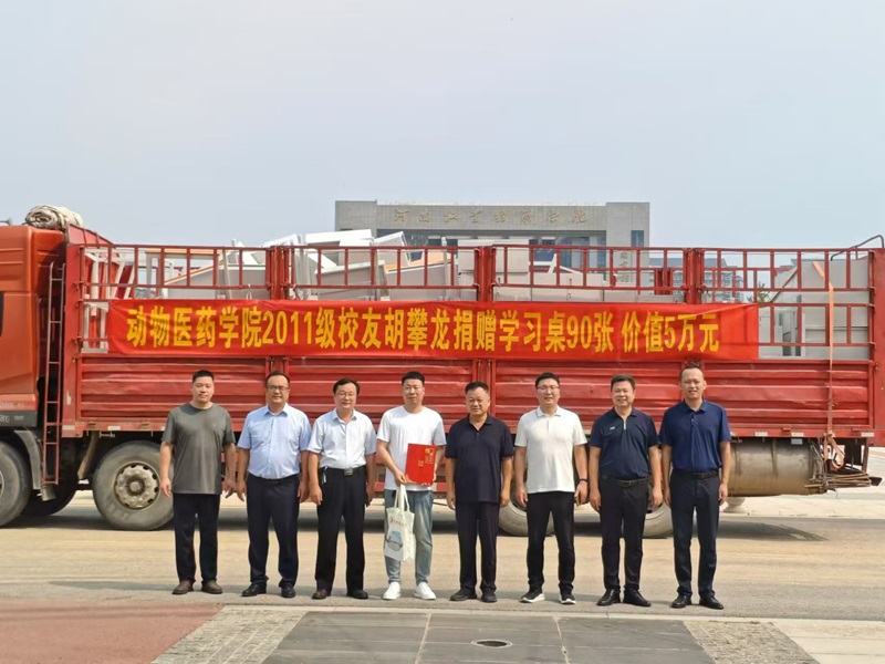 8月25日,我校银河集团186net2011级兽医医药班校友、臻远(河南)家具有限公司总经理胡攀龙向母校捐赠90套学习桌。副校长席磊、党委学工部部长郝景昊、后勤处处长邵轶铭、校友办主任王明栓、银河集团186net党委书记胡卫东、党委学工部副部长王宏魁、银河集团186net党委副书记汪洋共同出席了捐赠仪式。