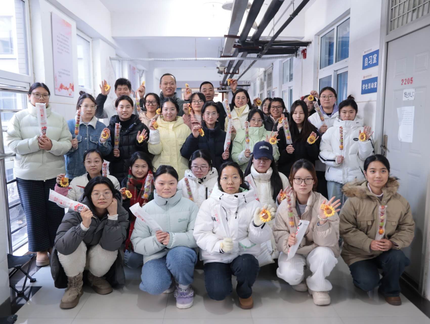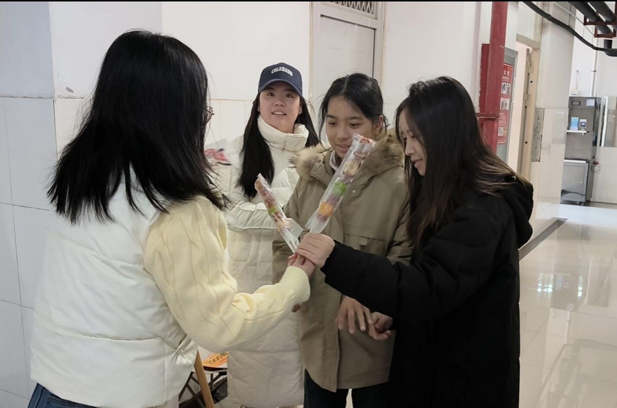 活动伊始,副院长汤法银、党委副书记汪洋携同我院辅导员队伍步入自习室,与考研学子们进行了面对面的亲切交流。他们温馨寄语,鼓励学子们要目标清晰,信念坚定,勇于面对挑战,充分利用好备考冲刺的每一刻,以饱满的精神风貌迎接即将到来的考试。同时,学院郑重承诺,将持续提升服务保障质量,为考研学子们营造一个更加优良的学习环境,全力做好他们的坚实后盾。随后,老师们精心准备了糖葫芦、寓意吉祥的挂件等礼物,并亲手赠予每位学子。现场氛围热烈而温馨,学子们深受感动,纷纷向学院表达了诚挚的谢意。最后,全体参与人员合影留念,共同铭记这一温馨瞬间。大家齐声高呼“好运连连,一举夺魁”的励志口号,这响亮的口号不仅是对自我的鼓舞,更是对学校精神的传承与发扬。活动结束后,学子们纷纷表示,学院的关怀与鼓励是他们前行的最大动力。21动医02班的张佳琪备受鼓舞,她表示将在接下来的备考冲刺中,迎难而上、勇往直前,努力实现自己的考研梦想,用优异的成绩回馈学院的培育与关爱。