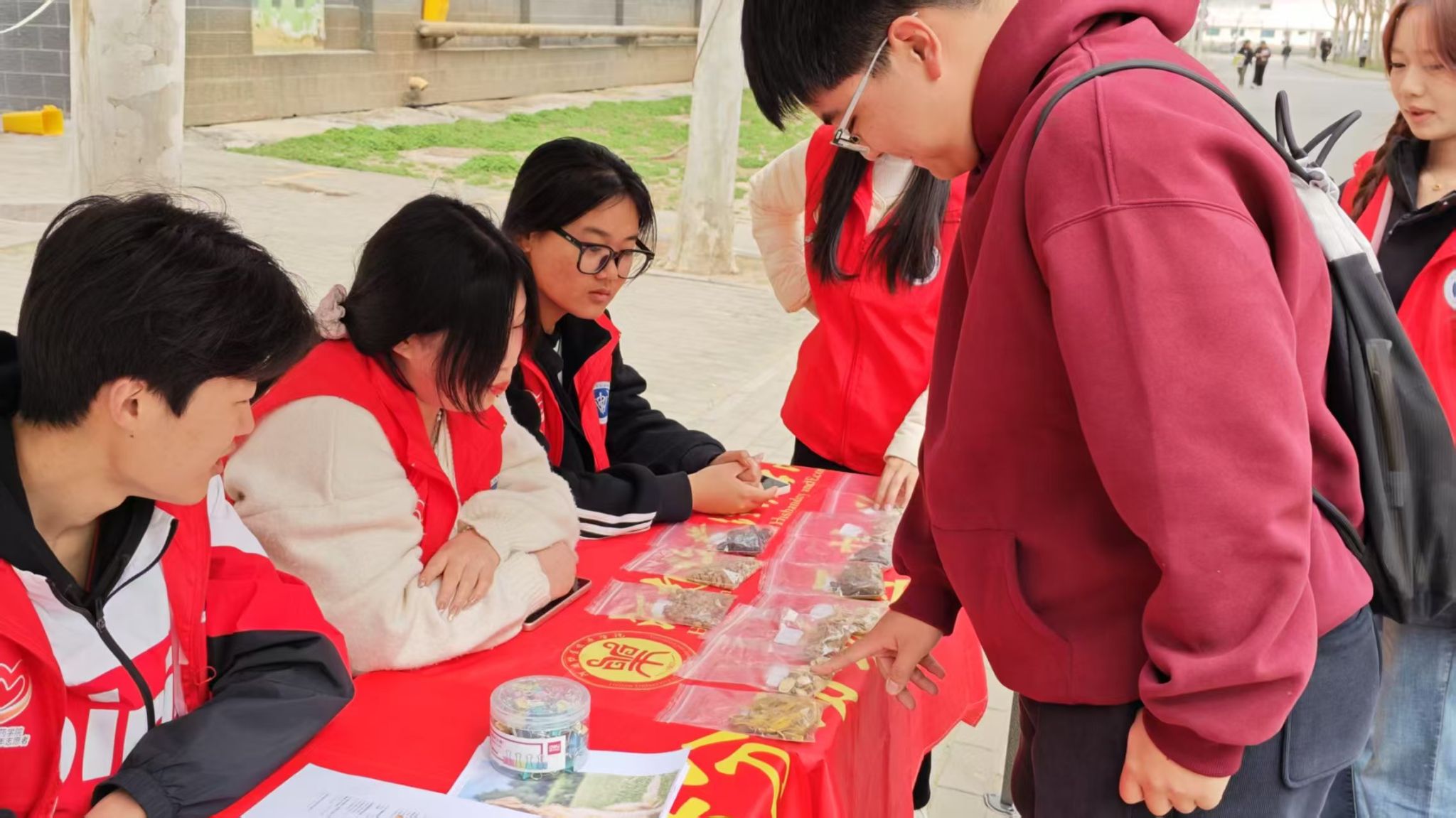 活动现场,志愿者们化身文化使者,在中药展示台精心陈列黄芪、当归、五味子等20余味药材,逐一讲解其性味归经及临床效用。为增强趣味性,活动还设计了“答题闯关”环节,帮助同学们科学认识中医药原理,破除误解。同时,在互动中近距离感受了中医药文化的博大精深,推动了传统医学智慧与现代生活的融合。此外,活动还聚焦中医药在宠物治疗中的应用。志愿者们通过生动的海报展示和现场讲解,向同学们普及了中药在宠物诊疗中的作用。