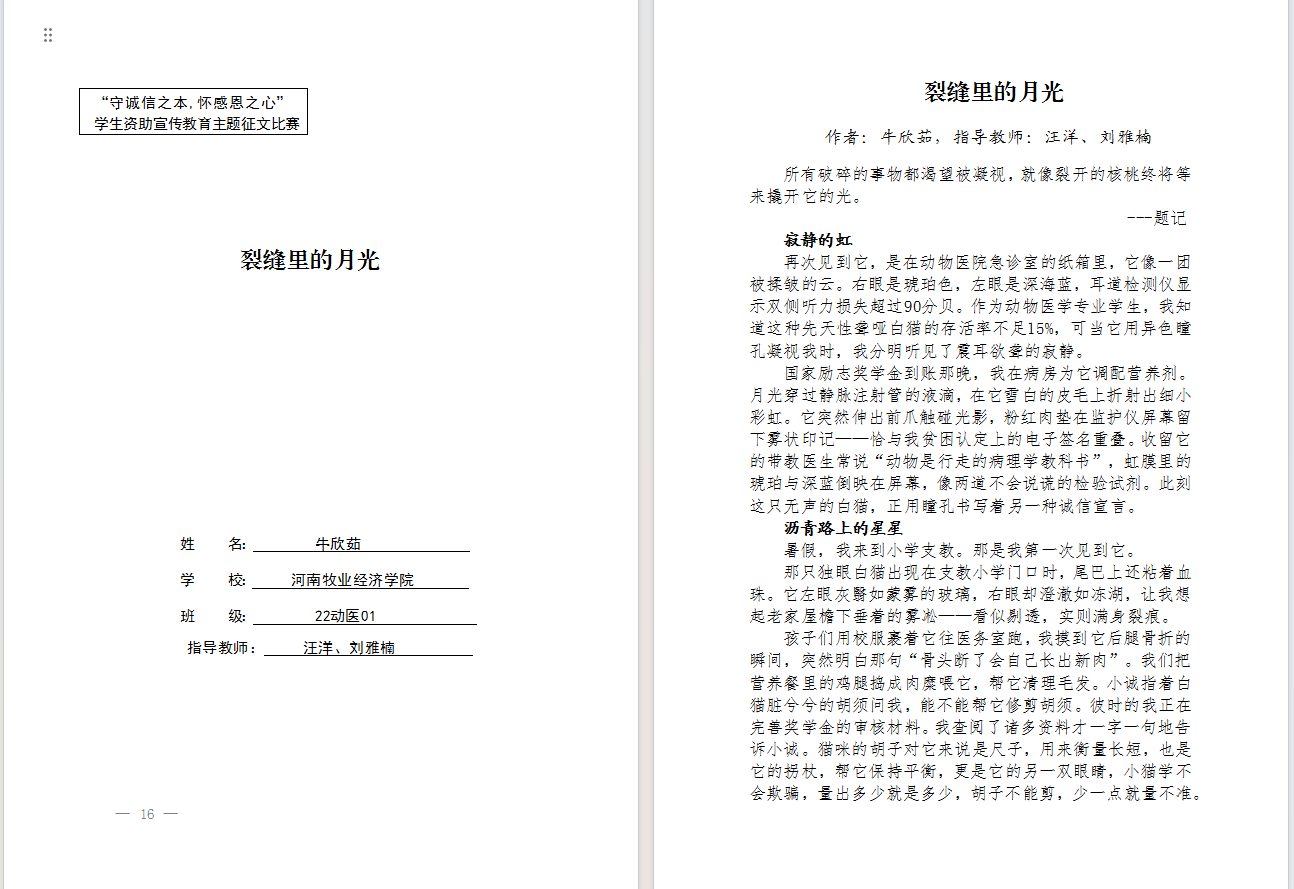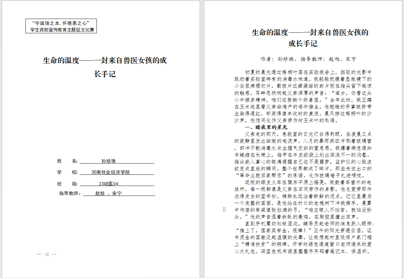 此次征文大赛不仅是一次文学创作,更是一堂生动的感恩教育课。青年学子通过回顾受助经历、讲述成长故事,深刻体会国家的关怀,进一步强化社会责任感和奉献精神。我院将持续深化诚信与感恩教育,不断创新资助育人形式,助力学生全面成长成才。(谷茜茜文/图)