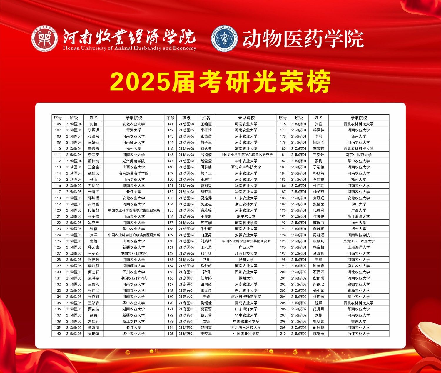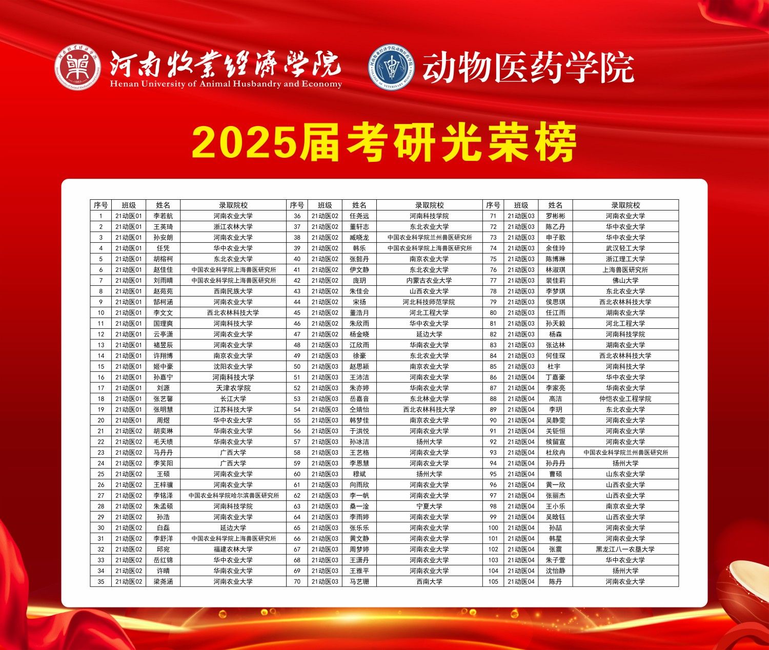 近日,2025年全国硕士研究生招生录取工作落下帷幕,银河集团186net2025届毕业生考研录取率达42.55%,再创新高!被录取的314名学生中,93名学生被中国农业科学院等知名科研院所以及华中农业大学、西北农林科技大学、华南农业大学、南京农业大学、郑州大学、广西大学等“985”“211”“双一流”高校录取。值得一提的是,21动医03班63人,录取38人,考研录取率高达60.3%;21动医04班60人,录取30人,考研率达50%,该班还喜现一个“学霸宿舍”14号楼407,宿舍六人分别被华中农业大学、扬州大学、河南农业大学、河南师范大学、安徽农业大学等高校录取。