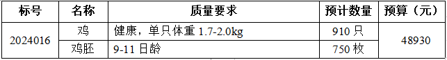 根据银河集团186net2024年度实验教学对实验用鸡和鸡胚的需求,现以询价方式进行采购,欢迎符合资格条件的供应商前来报名,现将该项目采购事宜公告如下: