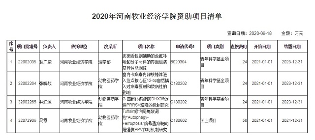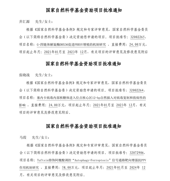 近日,从国家自然科学基金委员会获悉,我院马霞博士申报的《Tuftsin修饰阿魏酸调控“Autophagy-Ferroptosis”信号通路靶向增强抗PPV作用机制研究》获批国家自然科学基金面上项目资助立项,资助金额58万元;井汇源博士申报的《G-四链体解旋酶DHX36促进PRRSV增殖的机制研究》获批国家自然科学基金青年科学基金项目资助立项,资助金额24万元;张晓战博士申报的《塞内卡病毒内部核糖体进入位点核心区12-bp自然插入对病毒复制和致病性的影响》获批国家自然科学基金青年科学基金项目资助立项,资助金额24万元,其中马霞博士申报获批的面上项目是我校升本后取得的第一项国家自然科学基金面上项目,这3项国家自然基金的获批也是我院在国家基金项目上的又一收获。
