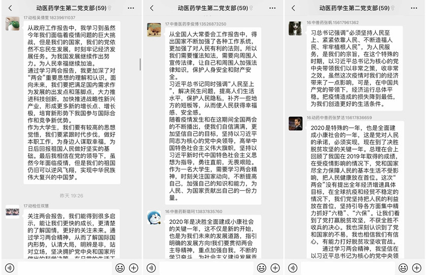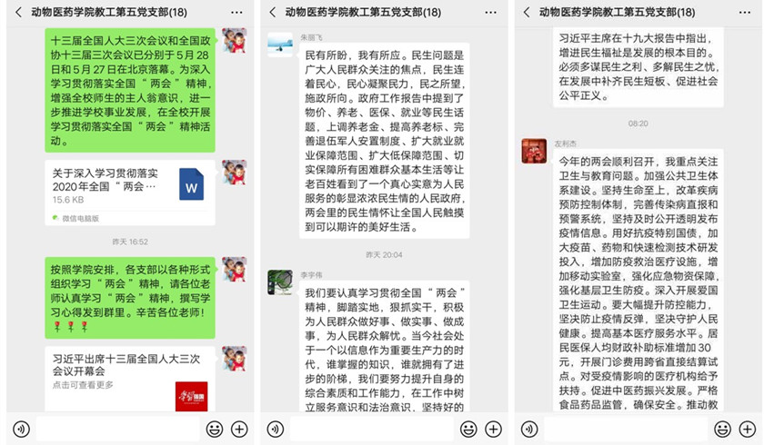 学院教工和学生党支部结合自身工作实际情况,分别组织本支部党员学习习近平总书记重要讲话,政府工作报告,两会“热词”,以及两会成果等相关材料,积极号召大家关注国家民生、关注时政热点。今年的全国“两会”是在我国疫情防控取得重大战略成果、统筹推进疫情防控和经济社会发展工作取得积极成效的大背景下召开的重要会议。各支部党员纷纷围绕全国“两会”热点,结合本职工作实际展开热烈讨论,并通过观看直播、读时评、写心得等多种途径,多层次、多渠道领会和学习两会精神。