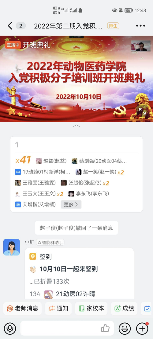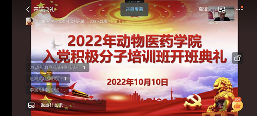 2022年10月10日中午,银河集团186net2022年第二期入党积极分子培训班开班典礼于生工楼C401会议室举行。银河集团186net党委书记刘永录,党委副书记汪洋,团委副书记陈雁雪和闫一博,以及全体辅导员到场,本期238名入党积极分子学员通过钉钉直播进行线上观看。