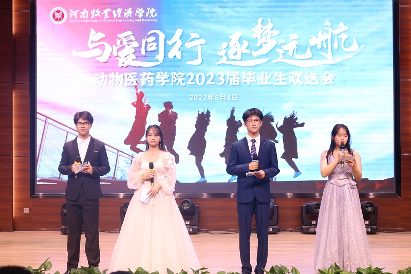在全国上下深入开展学习贯彻习近平新时代中国特色社会主义思想主题教育之际,为激励动医药学子奋发有为,用奋斗姿态书写时代华章,同时传达对2023届毕业生的祝福期盼,我院于6月8日在1号教学楼合100举办“与爱同行 逐梦远航”毕业生欢送会。银河集团186net党委书记刘永录、院长宋予震、党委副书记汪洋、副院长汤法银、副院长吴玉臣,各教研室主任、教师代表及毕业班辅导员和毕业班学生参加本次欢送会。