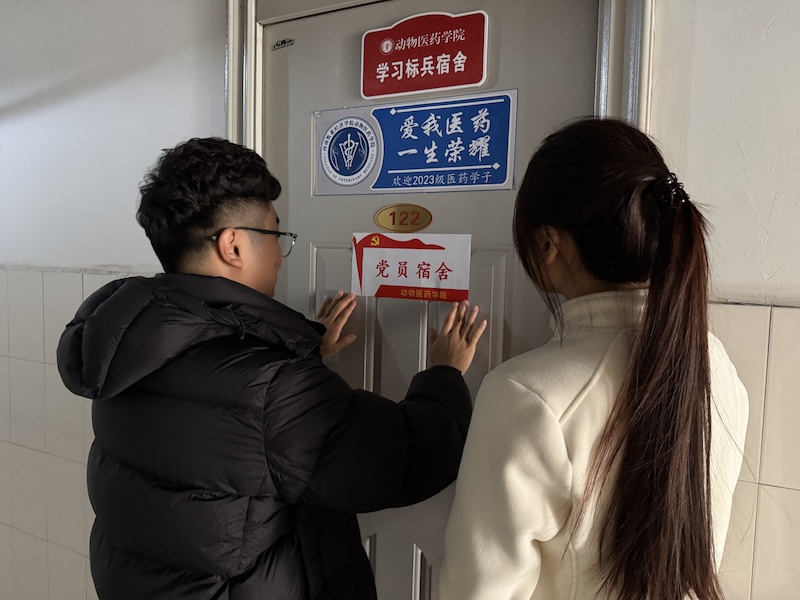 挂牌不仅是一份荣誉的象征,更是一份沉甸甸的责任与公开的承诺。悬挂于门前的“党员宿舍”标识牌,犹如一面镜子,时刻映照党员言行,督促其恪守标准、接受监督;也似一盏明灯,在方寸之地播撒光热,引领文明风尚。走进这些宿舍,整齐的内务、洁净的环境、向上的氛围,直观展现了学生党员严谨细致的作风,这正与动物医药专业所要求的精益求精、高度负责的职业精神内核相契合。参与挂牌的学生党员纷纷表示,将以此为契机,不仅要在专业学习和科研实践中追求卓越,更要在日常生活、公共卫生、服务同学等点滴细节中以身作则,将党员的责任感与未来兽医师、药学工作者的使命感相融合,带动室友共同建设安全、文明、和谐、进取的“标兵宿舍”。