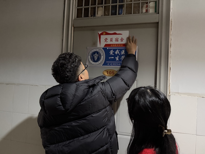 本次党员宿舍挂牌活动,是学院将思想政治教育工作与专业素养培育、日常管理服务深度融合的重要举措。它使学生党员的先锋模范作用具象化、日常化、可视化,推动他们更紧密地联系同学、服务同学,践行“从学生中来,到学生中去”的群众路线。同时,通过树立可见、可学、可比的身边榜样,有效激发全体同学,特别是未来将肩负动物健康与公共卫生安全重任的动医学子,形成“比、学、赶、帮、超”的积极氛围,不仅促进优良室风、学风的养成,更在潜移默化中锤炼学生恪守规范、勇于担当、甘于奉献的职业品格,为培养德才兼备的新时代动物医药事业接班人筑牢基层阵地。(文/图 苏逸飞)