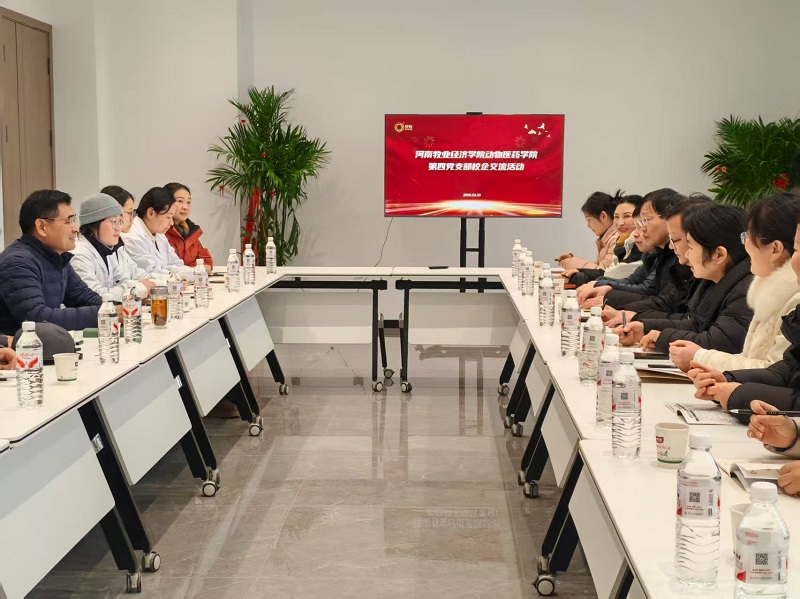 参观结束后,校企双方召开专题座谈会,围绕合作模式创新、精准人才培养、核心技术联合研发等关键议题深入研讨。学院第四党支部书记介绍了学院在动物医药领域的学科优势、科研实力及人才培养特色,提出“党建共建为引领、项目合作为核心、人才共育为目标”的合作思路;企业负责人结合发展需求,明确了病料检测、药品检测、中西药复配研发、精密检测技术应用等合作方向。