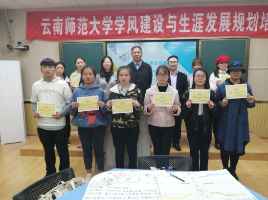 第二阶段培训于11月14日下午开展,夏磊老师进行了职业决策与行动计划等方面的课程培训。他阐述了职业生涯决策中的重要选择、大学生常见的职业决策问题、决策过程中的阻碍等内容,并对学生进行个别辅导、指导学生撰写生涯规划书。随后活动负责人夏慧组织全体学员分为10个小组团结协作绘制一位成员的职业规划海报,让学员更加直观地感受职业生涯规划的步骤和方法,随后小组成员上台展示,并投票选出优秀作品结业典礼于11月14日在数学学院216室举行。数学学院王源昌院长、刘冰楠老师、武海栋老师、夏磊老师为学员颁发培训证书及奖状。王院长勉励同学们进一步明确学习目标,端正学习态度,增强学习动力。