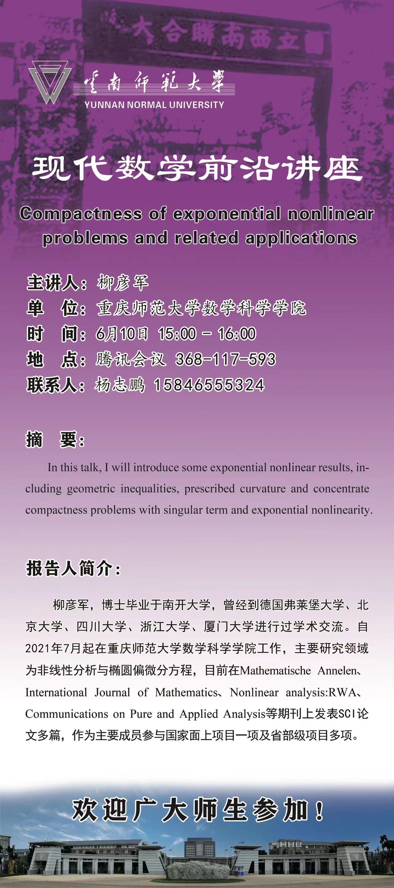 现代数学前沿讲座 柳彦军 博士 Compactness of exponential nonlinear problems and related applications