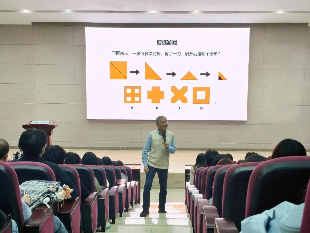 对称图形的研究是本次讲座的另一大亮点。林亚楠教授以2025年央视春晚开场画面为引,带领同学们逐一分析视频中的图形元素,总结出多种对称类型,互动过程生动活泼。他还引导大家深入思考不同维度的对称问题,通过展示几何玩具与特色图案,邀请同学们观察对称图形的拼接与切割方法,让讲座充满探索乐趣。在此基础上,林教授系统梳理了图形运动的四种类型,丰富了同学们的知识体系。