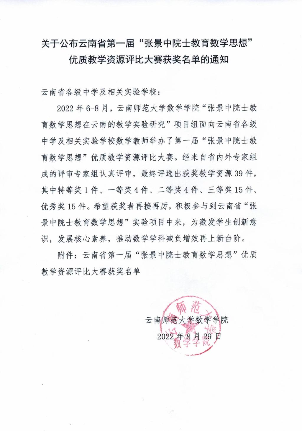 关于公布云南省第一届"张景中院士教育数学思想"优质教学资源评比大赛获奖名单的通知