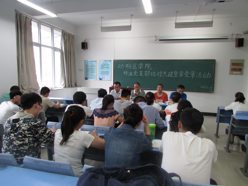 按照《动物医学院关于开展“两学一做”学习教育的实施方案》要求,积极探索新时期基层党支部建设的新途径,认真扎实开展“两学一做”学习教育,我院于2016年5月19日下午,在生工组团A座412、413两个教室成功开展师生党支部“结对共建”暨学党章活动。院党总支副书记张瑞春,各教师党支部、学生党支部书记,部分教师党员及全体在校学生党员参加活动。