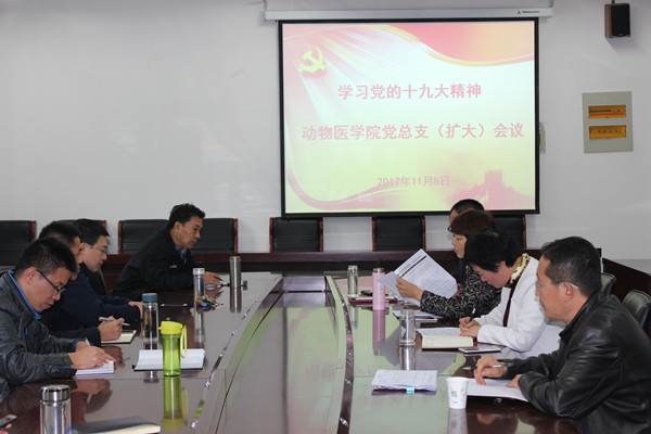 11月8日上午,动物医学院在生工组团C401会议室召开党总支扩大会,学习贯彻党的十九大精神,学院党总支委员、各党支部书记、科级以上干部参加会议,会议由党总支书记王春明主持。