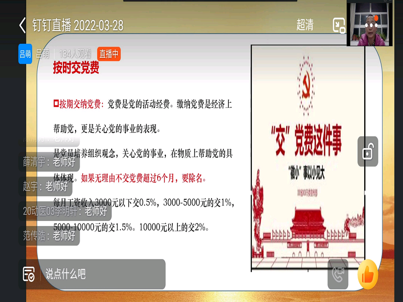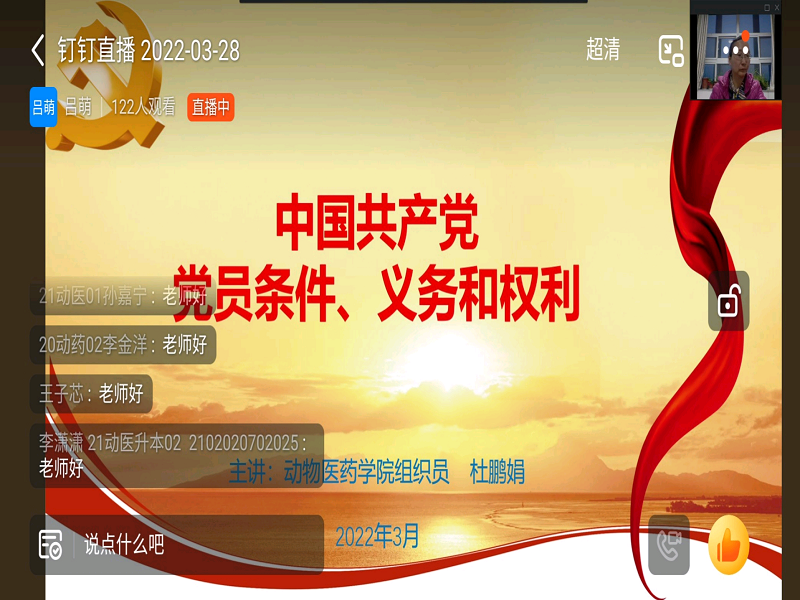 为提高入党积极分子对党员队伍的认识,加强入党积极分子对党员基本条件的理解,认真履行并正确实施党员义务和党员权利。3月28日下午,入党积极分子培训课程第五讲《中国共产党党员条件、义务和权利》开讲,此次专题讲座由银河集团186net正处级组织员杜鹏娟老师讲授,全体入党积极分子学员通过钉钉直播进行线上学习。