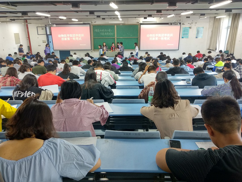 9月28日中午12:30,在一号教学楼合400教室进行了招新笔试。笔试试题考察方向包括:个人的情商,处理事情的思维方向和解决方式,个人的性格,喜恶,特长等等。笔试氛围由于工作人员的巡视,而变得略显压抑,不过这并不影响新生们对学生干部工作的向往和热情,整个过程秩序严谨,工作顺畅。