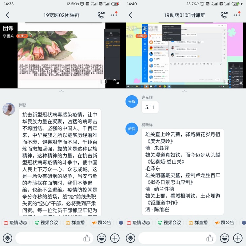 本周团课各班均采用直播的形式开展。首先,各班主持人带领同学们观看《雄关》,并提出一系列问题,引导团员青年把学习观看《雄关》与深入学习贯彻新冠肺炎疫情发生以来习近平总书记发表的重要讲话结合起来。同学们针对主持人提出的问题激烈讨论,纷纷表示,作为优秀团员青年的我们一定要坚定信念,在这场新冠病毒肺炎疫情中,加油呐喊,众志一心,以平凡的点滴力量坚守后方。通过观看《雄关》,同学们看到在这场抗疫战争中,河南坚决听从习近平总书记号令,凝心聚力、众志成城,动员一切可以动员的力量构筑一道坚不可摧的“中原防线”,调集一切可以调集的资源为全国疫情防控贡献“河南力量”。同时,同学们也感受到了在党的领导下打赢疫情防控阻击战的制度优势,见证了危难时刻挺身而出的中国精神。疫情仍未结束,我们仍须慎终如始,不忘初心、牢记使命,发扬不畏艰险、无私奉献的精神。