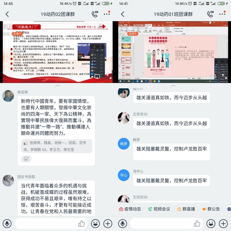 5月14日下午2:30,我院组织19级各班在钉钉团课群中开展以“中原抗疫勇担当,众志成城铸雄关”为主题的团课学习活动。