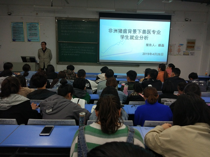 2019年4月26日晚6:30,《非洲猪瘟背景下的兽医专业学生就业分析》就业指导主题讲座在龙子湖校区1号教学楼合203顺利开展,本次讲座邀请到了哈药集团生物疫苗有限公司区域经理颜磊为我院学生授课,讲座由动物医学院团总支书记王宏魁主持。