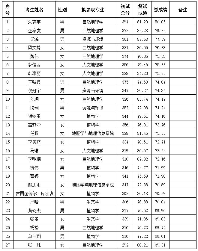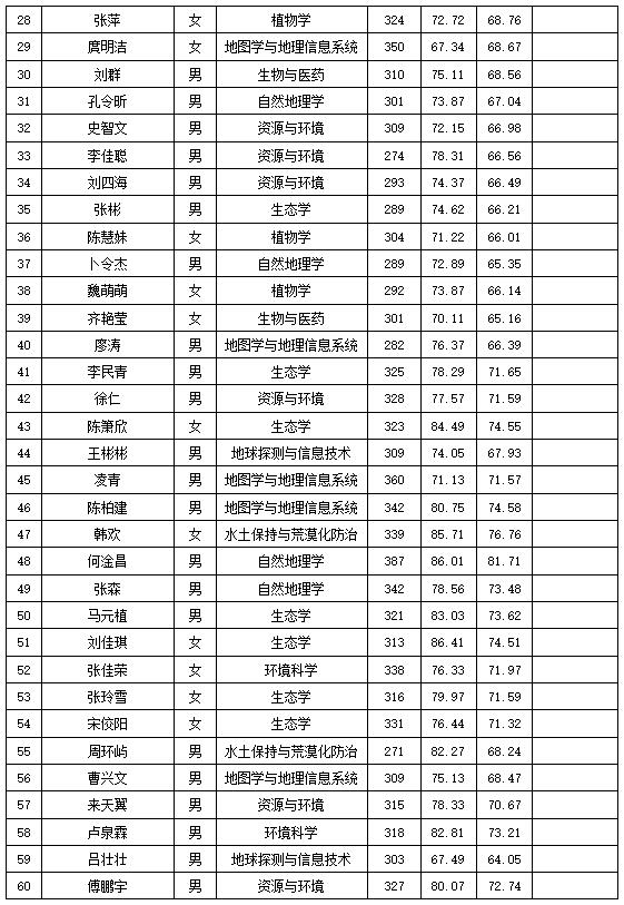 经初试、复试等环节考核考察,新疆生态与地理研究所确定拟录取朱建宇等为我所2021年硕士研究生,具体名单如下: