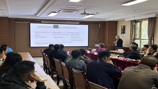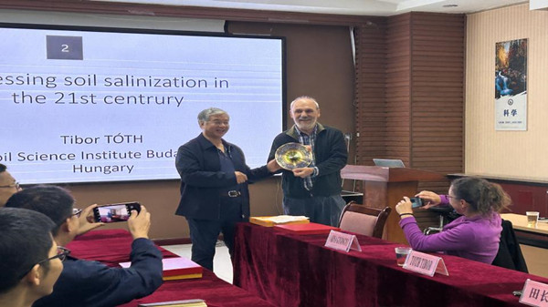 9月14-15日,应新疆土壤与肥料学会理事长、中国科学院新疆生态与地理研究所田长彦研究员邀请,匈牙利科学院土壤与农业化学研究所、前国际土壤学联合会盐渍土专业委员会主席Toth Tibor教授及Barna Gyongyi二人来疆进行学术交流,并作了题为“Assessing soil salinity in the 21st centry”的学术报告。田长彦致欢迎词并代表学会赠送学会标识纪念牌。