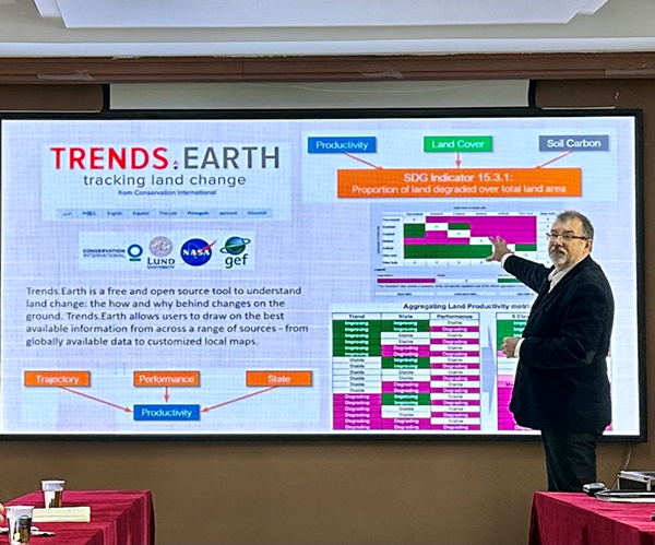 German Kust作了题为“土地退化零增长是实现可持续土地管理和气候变化适应的有效方法与途径”的报告,详细介绍了土地退化零增长的概念、评估方法、评估指标以及存在的问题和挑战。他还以土地利用/土地覆盖变化、土壤保水性、土壤碳平衡、土壤侵蚀、干旱指数等指标为例,详细讲解了各类评估指标的土地退化评估结果。参会人员就土地退化零增长评估基期选择、最新评估技术等问题进行了交流和讨论。