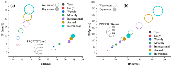 图1. 不同时间尺度上中亚天山地区干、湿季的极端降水变率特征。