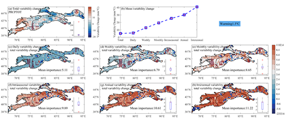 极端降水是一类突发性更强、影响更严重、对温度变化更敏感的降水事件。强降水事件对温度的响应速率明显快于全球平均降水变化值,约以6-7%/ C(CC率,克劳修斯-克拉珀龙关系)增长。然而,在区域尺度上,受大气环流强度影响,出现了超CC率现象。虽然理解极端降水变率的变化对减缓社会损失至关重要,然而,人们对极端降水变率的认识并没有一致的结论,尤其是在中亚天山这一缺资料、少资料地区。针对这一重大的科学与现实问题,中国科学院新疆生态与地理研究所荒漠与绿洲生态国家重点实验室陈亚宁研究员团队基于经过降尺度和偏差校正处理的最新一代的CMIP6全球气候模式输出的日降水数据,从天气到年际尺度,量化了气候时期中亚天山地区的极端降水变率的状况,并预估了未来不同温升水平下极端降水变率的变化趋势。