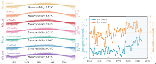 图3. 历史时期中亚天山地区气温变化。左侧图自上而下分别是(a)未经过滤处理的,(b)日尺度,(c)周尺度,(d)月尺度,(e)季节内,(f)年内和(g)年际尺度上的日平均气温变化及相应的变率。右侧图是中亚天山地区干、湿季的气温距平变化。