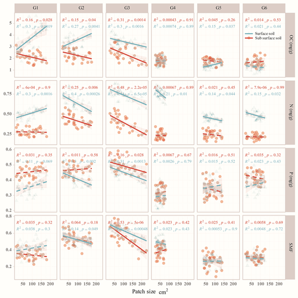 生物土壤结皮在养分限制的荒漠生态系统中广泛分布,其中苔藓结皮作为生物土壤结皮演替的高级阶段,通常形成斑块状结构镶嵌在裸地上。前期研究表明,斑块大小对苔藓植物的养分影响不一致,认为这些独立的“斑块”可被视为微生态系统,在植物-土壤养分循环中发挥着至关重要的作用。荒漠生态系统中土壤养分的分布受多种因素的影响,特别是结皮的覆盖对表层土壤养分含量具有重要的影响。不同面积结皮斑块反映结皮发育程度与微生境之间的作用关系,从而影响土壤养分循环和多功能性。然而,目前还不清楚荒漠区藓类结皮斑块大小如何影响土壤养分的分布格局和土壤多功能性,揭示生物土壤结皮养分功能性状的斑块效应,将有助于深入理解荒漠生态系统结构与功能的维持机理。