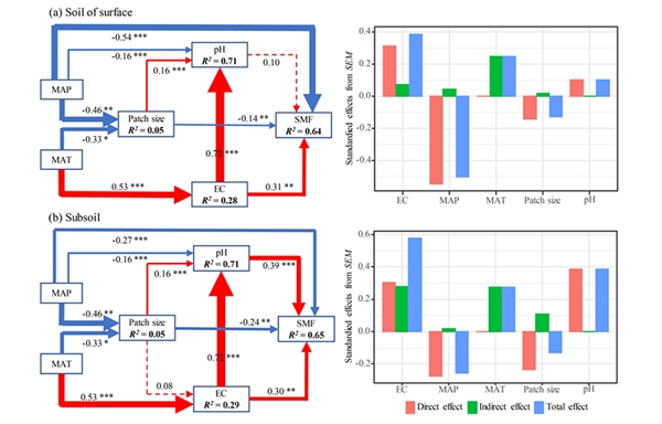 图2 结皮层(a)和结皮下层土壤(b)中环境因素、土壤因素和斑块大小预测土壤多功能性(SMF)的结构方程模型