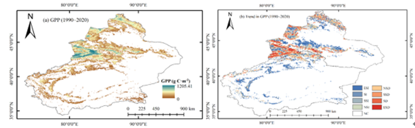 图1. (a)新疆林草植被GPP的多年平均分布和(b)趋势变化。