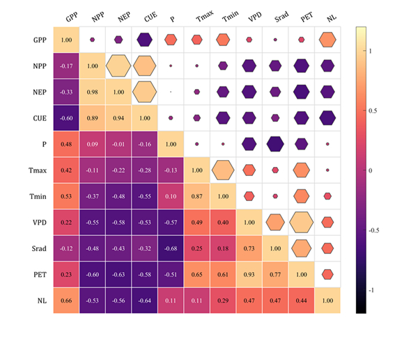 图2. 选择的解释因子与新疆林草植被CSC的关系热图。