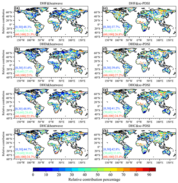 图1. 热浪和干旱对CDHWSs的相对贡献。分别统计了[0、30]、[30、60]和[60、100]百分位区间内相对贡献所占的比例。