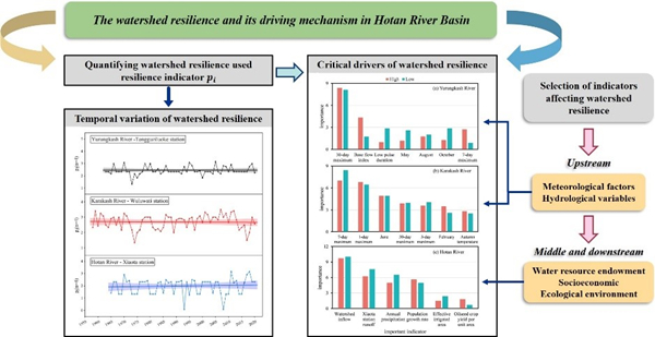 针对上述问题,中国科学院新疆生态与地理研究所阿克苏绿洲农田生态系统国家野外科学观测研究站郝兴明研究员团队以和田河流域为研究区,研究了1958-2020年和田河流域恢复力的时空变化规律,构建流域上游产流区和中下游耗水区水资源恢复力的评价指标体系,结合随机森林模型和主成分分析法,揭示了产流区和耗水区流域恢复力的驱动机制。