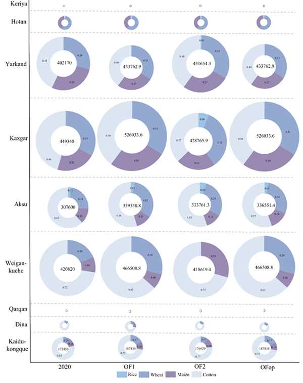 图1 塔里木河流域2020年及不同优化情景下作物种植面积变化