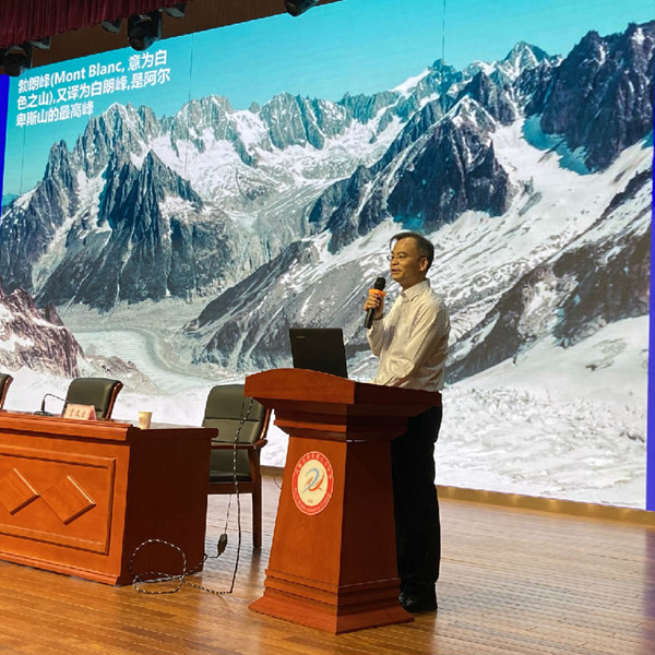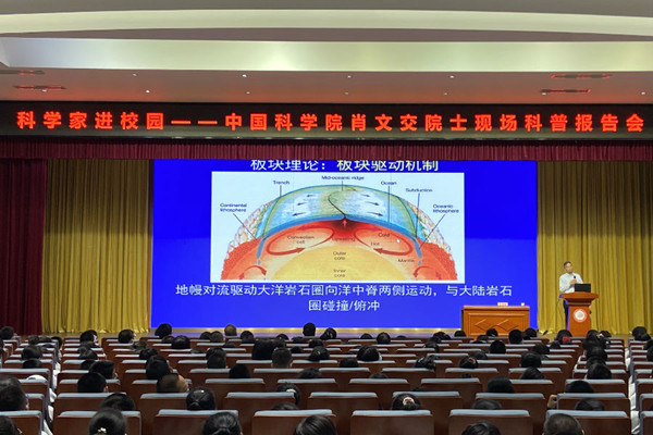 在40分钟的时间里,肖文交院士深入浅出地从地质学层面讲述了地球故事。地球的年龄、板块的运动、我国科学家在青藏高原科考的历史、苏格兰的“擎天岩柱”、海底世界的奇特地貌,一帧帧画面闪过,一个个精彩的知识点溢出,紧紧抓住在场的学生注意力。