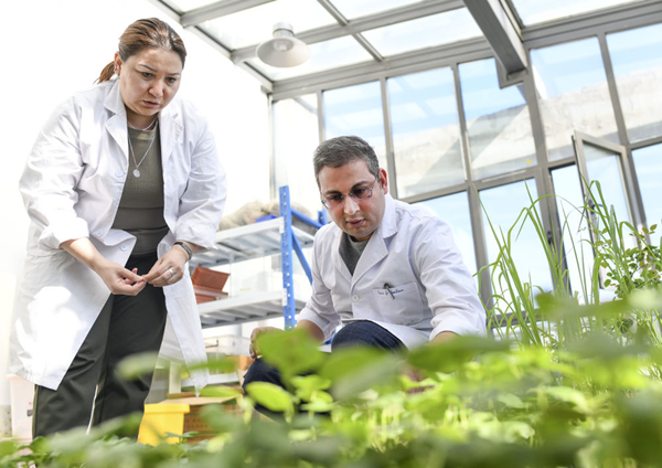 在中国科学院新疆生态与地理研究所,奥萨马·阿布达拉·阿布德尔沙菲·穆罕默德(右)和同事在研究植物(5月18日摄)。新华社记者 王菲 摄