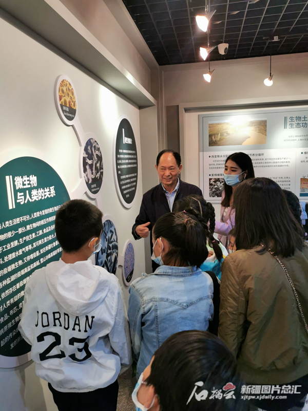 2021年5月22日,石榴云/新疆日报通过多平台联动直播,带广大网民走进新疆自然博物馆。图为中国科学院新疆生态与地理研究所研究员管开云正在给参观的小观众讲解有关植物的知识。