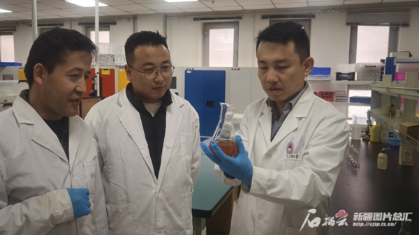 3月6日,中国科学院新疆生态与地理研究所环境污染与生态修复实验室内,自治区“天池英才”引进计划青年博士裴亮(右一)正带领研究小组开展相关研究。来天翼摄