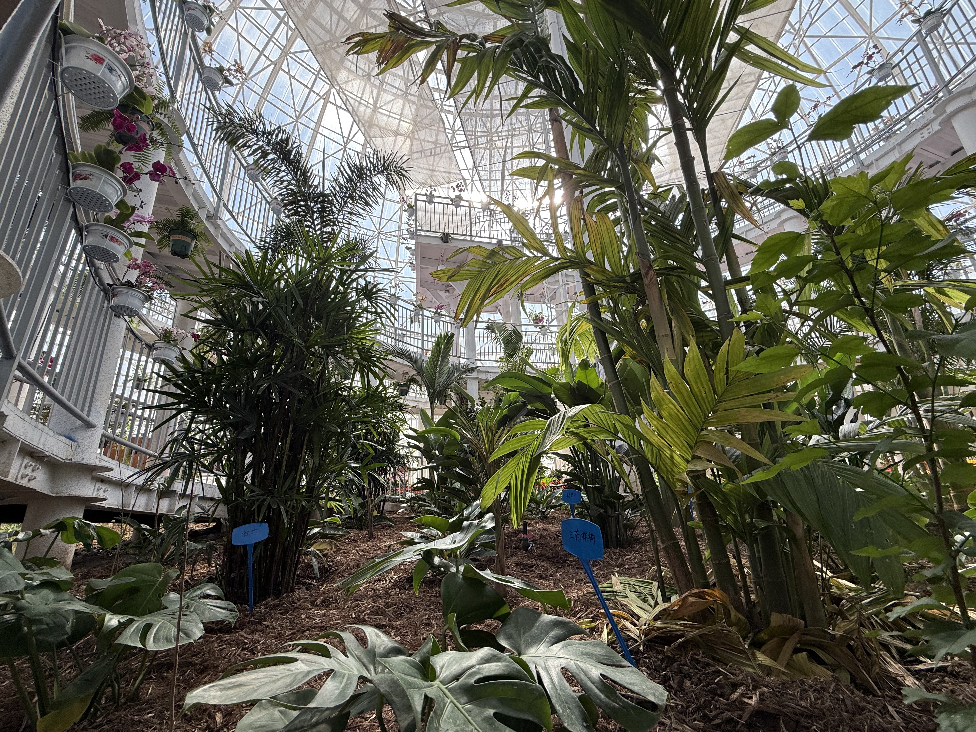 四大主题展馆包括热带雨林馆,展馆面积1075.2平方米,馆内近400种新疆罕见的典型热带物种构建出浓郁雨林风情。毗邻的亚热带植物馆,展馆面积1520平方米,堪称奇花异卉殿堂,近400种珍稀观赏花卉如“茶族皇后”金花茶、绚丽杜鹃、硕果香蕉、地涌金莲等争奇斗艳。荒漠植物馆面积284.7平方米,方寸之间浓缩旱地智慧,汇聚超过300种形态奇崛的荒漠精灵与多肉植物,尤以20余种神秘“石头花”(生石花)为亮点。作为温室“心脏”的植物繁育馆,面积2625平方米,承担着域外珍稀濒危物种的引种驯化、苗木繁育及科研材料供给重任。